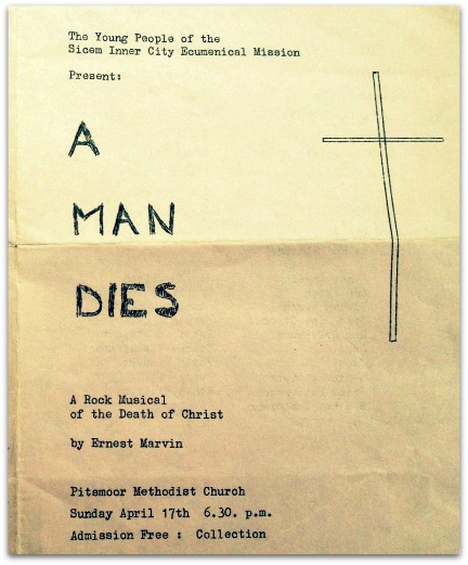Vinner, Timbo and Wilma recently played in the local Methodist church production of ‘A Man Dies’, an obscure, pop-opera precursor to ‘Joseph and the Amazing Technicolour Dreamcoat’. Sometimes on a Sunday evening we are invited around to the Reverend’s (“Call me Ian!”) flat to sit on bean bags, and listen to ‘Tapestry’ by Carole King or ‘Alice’s Restaurant’ by Arlo Guthrie. There’s no “message” as such, but the invitations wither when we decline to join in worship, which also happens to coincide with us discovering the pub.