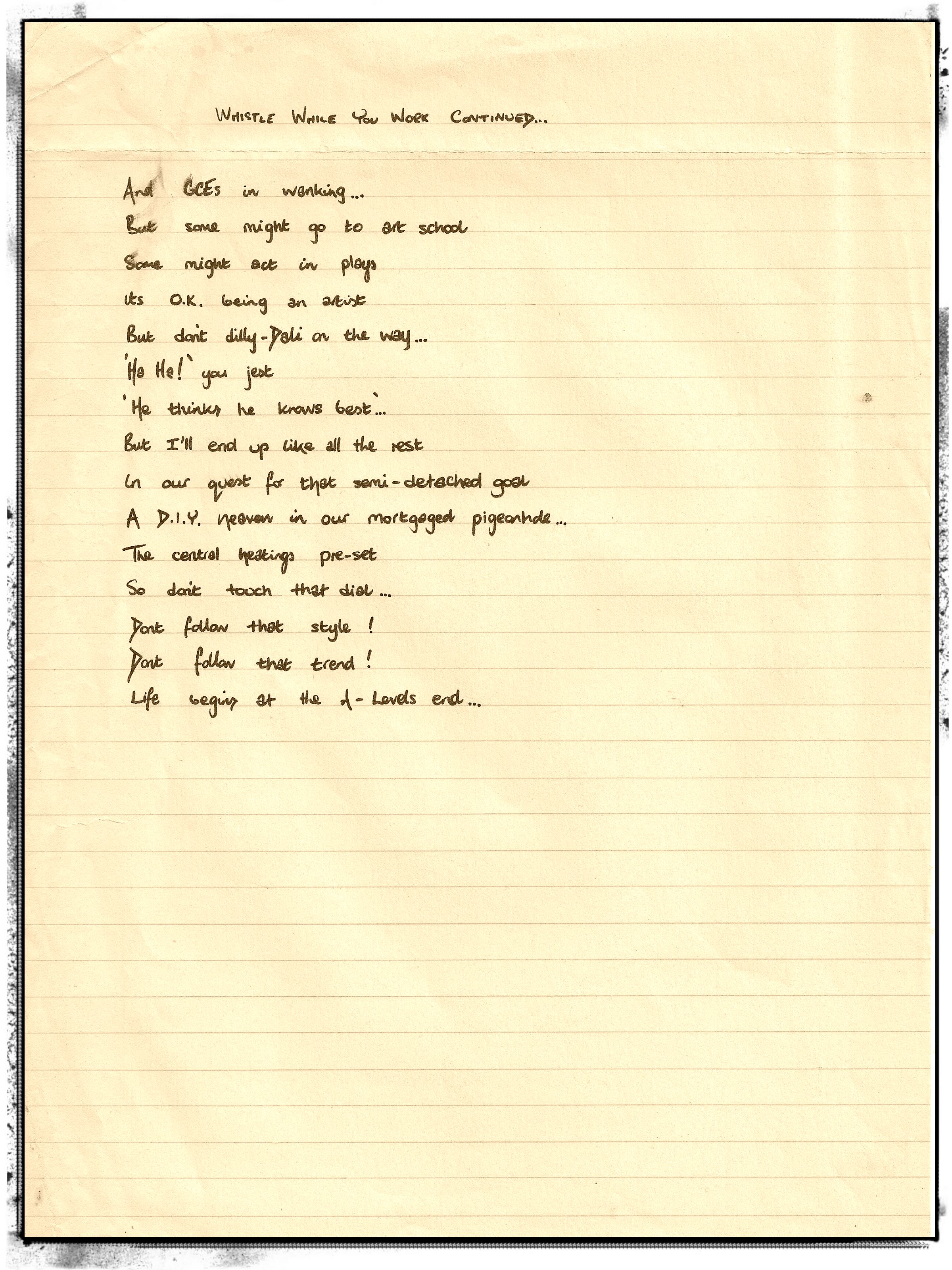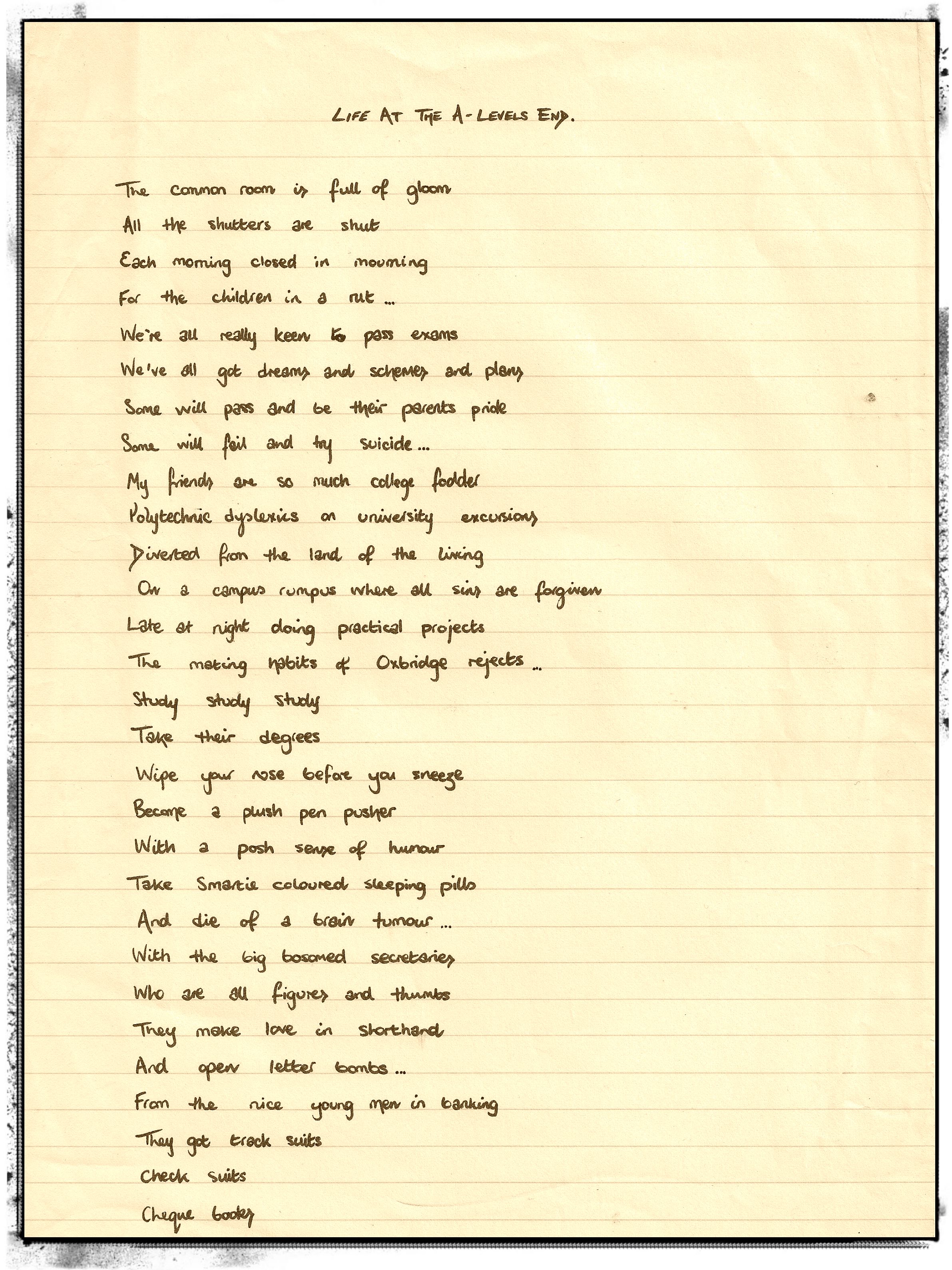 Such was the influence of JCC in 1979, I wrote this tribute / homage / rip-off. With apologies to all concerned, here is some actual sixth form poetry: