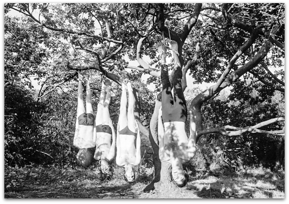 (Pete adds: As a bit of background, it was taken on a Sunday morning, I can’t remember exactly where, I think up the Porter valley from Endcliffe Park. Each member of the band had a friend with them, to support them until we were ready to shoot, when I said the word, they would lower them down, and dash out of shot, until a member of the band started screaming with pain, when they rush back in to take the weight off their ankles. All the time, young parents were walking past, telling their kids not to look at the strange men in their underpants. Happy days!)