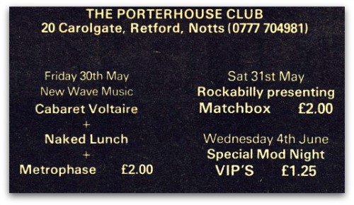 The trio haven’t played Sheffield in over a year, and curiosity is running high. In that time, they have released two albums – ‘Mix-Up’ and ‘Live At The Y.M.C.A.’ - and the singles ‘Silent Command’ and ‘Three Mantras’. I’ve been fortunate enough to see them a couple more times since my first strange and memorable encounter back in August 1978. A May trip to Retford Porterhouse with old school buddy Brent in his Tangerine Machine, an old Mk III Cortina; saw the Cabs battle valiantly with a timid PA and spartan light-show. The event is billed as the first ever “Futurist Fun Night”, with support from the trite and abysmal Naked Lunch and a new-born The The. We met the motor-mouthed promoter, a chubby John Bull Jr. called Stevo, who was wearing a black Ben Sherman with a red TG lightning flash sewn on by his Mum.