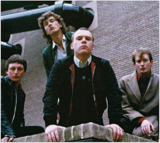 Drummer Hugo Burnham wouldn’t look out of place on the cover of a well-thumbed Richard Allen ‘Skinhead’ paperback. To his left stands a strikingly heroic Andy Gill, gold-sprayed Fender Kalashnikov in his hands, looking like a Viktor Ivanov Soviet propaganda poster. Together with bass player Dave Allen, they perform pincer movements around Jon King; the singer suited in muted grey two-piece, a lanky clothes-horse with aquiline features and tousled hair. A smart-looking band, the pleats in their pegs as sharp as their polemics. I wonder, briefly, if they have a flight case full of Corby trouser presses.