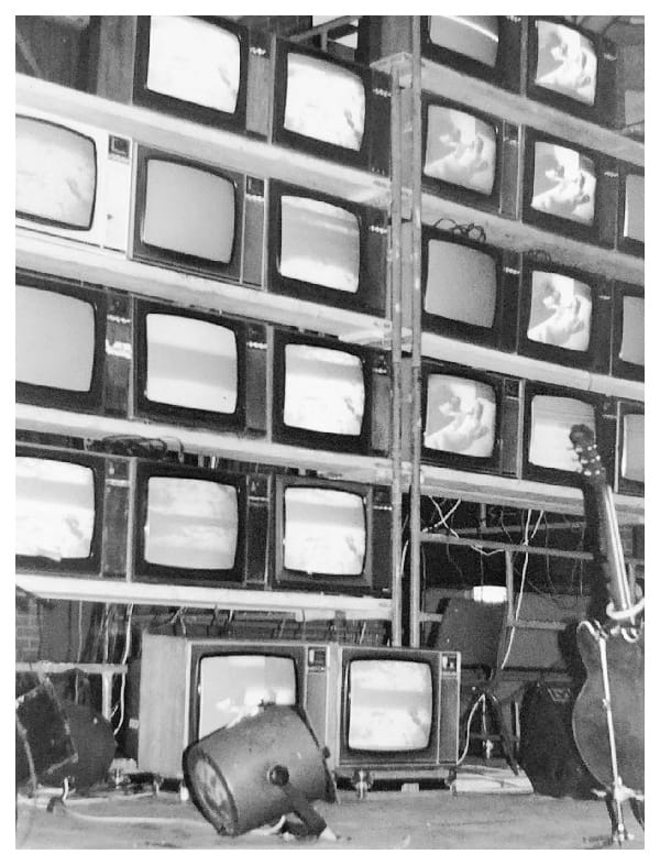 There is no support band tonight. Instead, the multiple screens flicker with film footage from the Cabs’ video archive: a moving melange that includes robotics, William Burroughs, firearms, tear gas, Joseph Beuys and Playboy girls, fiercely edited in a style that owes more than a little to the cut-up technique, pioneered in print by the Dadaist art movement in the 1920s. It’s an impressive installation, with even the TV sets that go on the blink or just offer a screen of snowy static seeming to add to the calculated randomness.