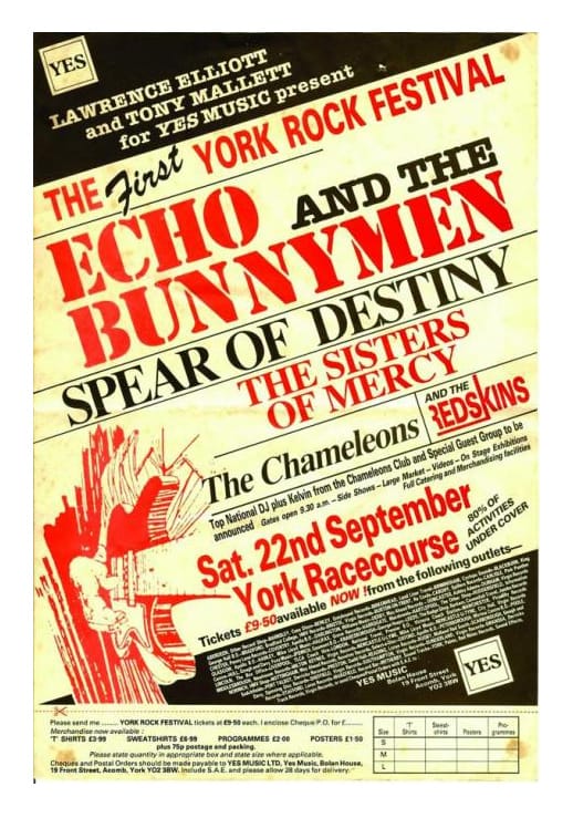 Top of the York Rock promoters’ wish-list were U2, but they have worked their way down through Simple Minds, Siouxsie and The Banshees, The Alarm and even Marillion, before arriving at Liverpool’s Echo & The Bunnymen, who are enjoying a run of hits from their new, critically-revered ‘Ocean Rain’ album. They have also smartly included a raft of bands from Manchester, Leeds and York on the bill, so the feel of the line-up is distinctly youthful, alternative, Indie and Northern. Add in special guests Spear Of Destiny from down South and you’ve got a very decent day out, with no hippies, bikers or football fans. All for less than a tenner.
